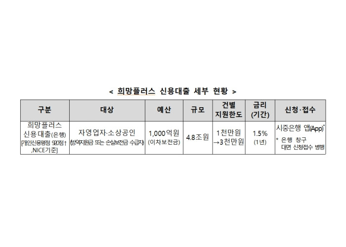 지원 대상에 '손실보전금 수급자 중 고신용자'도 추가희망플러스 신용대출 한도와 지원 대상이 확대됐다.희망플러스 신용대출은 신용보증기금의 이자 지원을 통해 은행이 고신용 자영업자·소상공인에게 1.5% 저금리로 자금을 공급하는 금융지원 프로그램이다.은행연합회와 신용보증기금..